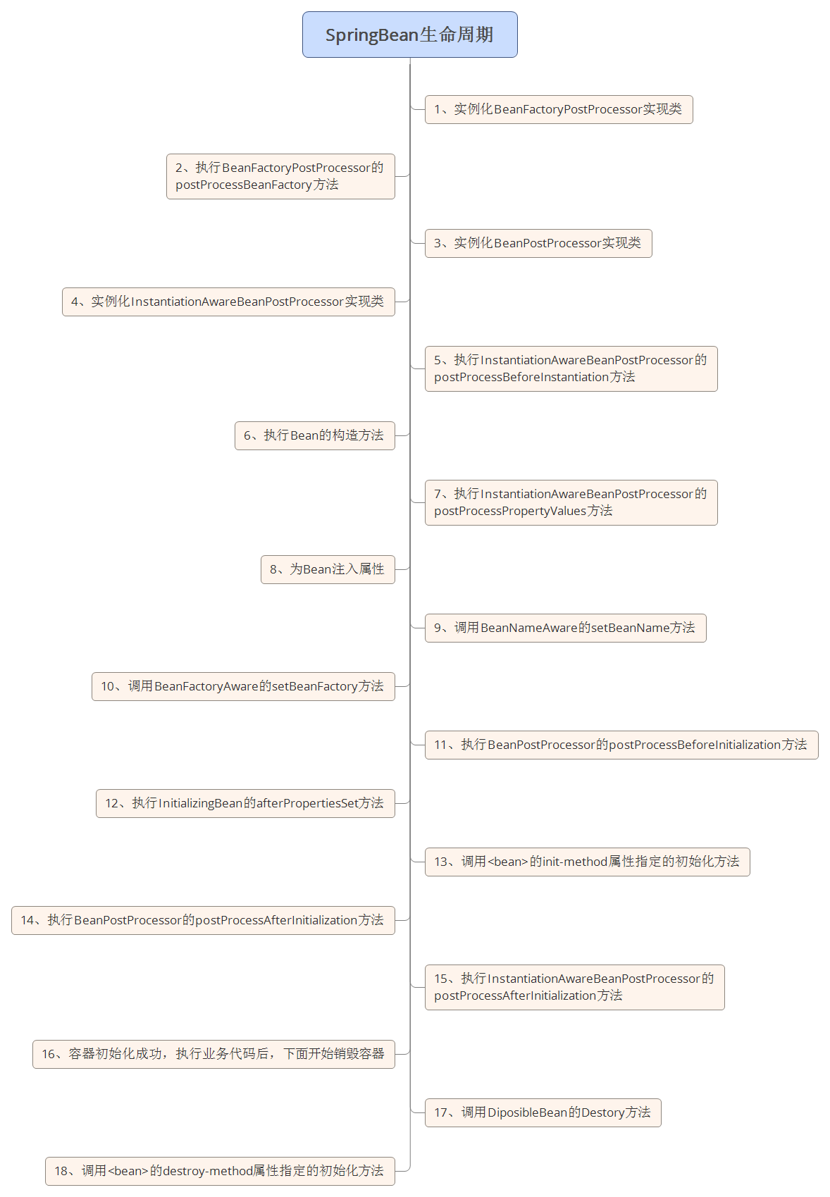 bean的生命周期 bean的完整生命周期从spring容器着手实例化bean开始,直到最终销毁bean。其中经过了很多关键点,每个关键点都涉及到特定的方法调用, 我们可以将这些方法大致分以下四类。 Bean自身的方法 Bean级生命周期接口方法 容器级生命周期接口方法 工厂后处理器接口方法 Bean自身的方法调用Bean的构造函数实例化Bean,调用setter设置Bean的属性值以及通过 的 ...