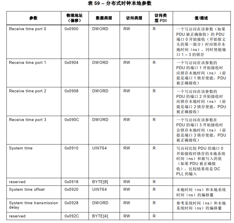 分布式时钟(Distributed Clock,DC)可以使所有EtherCAT设备使用相同的系统时间,从而控制各个设备任务的同步执行。从站可以根据同步的系统时间产生同步信号,用于中断控制或触发数字量输入/输出。支持分布式时钟的从站称为DC从站。 时钟术语的描述 Local system time 即本地系统时间,每个DC从站的本地时钟经过补偿和同步之后,都产生本地系统时...