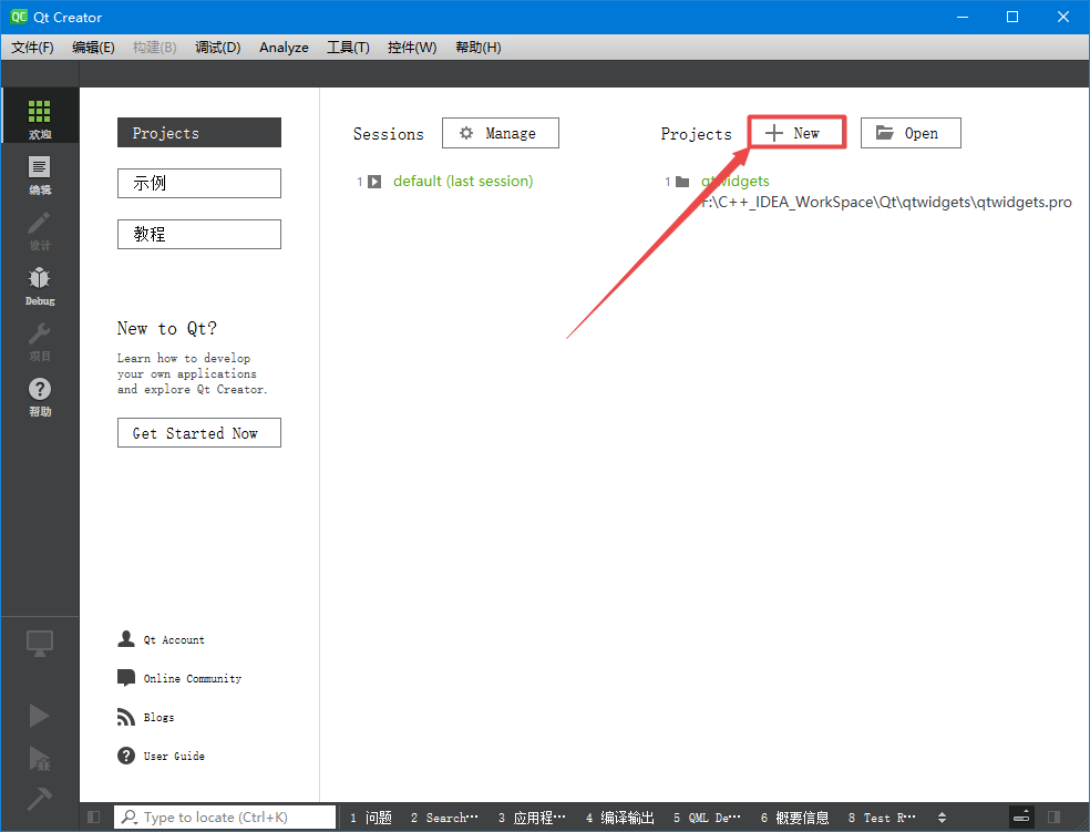 一、New 创建项目 二、Application -> QtWidgets Application 三、填写名称和路径 四、 Base class:QMainWindow 五、Language:Chinese(China) 六、配置项目 可以看到,刚创建的项目只有一个pro文件,需要点击左下方进行配置 七、添加按钮 八、运行项目...