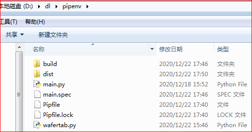 计算机是Windows 7旗舰版 32位操作系统。 Anaconda3,32bit版本 python3.7 在pipenv虚拟python环境下利用pyinstaller打包。 虚拟环境所在路径如下:源文件为main.py 和 wafertab.py 执行以下命令进行多文件打包: pyinstaller -F -w main.py --hidden-import wafertable....