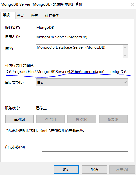 项目场景: 提示:MongoDB 服务无法启动: MongoDB安装后无法顺利启动,提示 问题描述: cmd输入net start MongoDB 提示无法启动服务: 搜索进入服务,找到MongoDB 右键属性 在常规里找到可执行文件路径,复制后粘贴到CMD命令框,运行后可看到出错点在哪里,打开mongod.cfg 关于启动的所有配置都在里面(在可执行路径里也能找到这个文件的路径,直接运行复制路径...