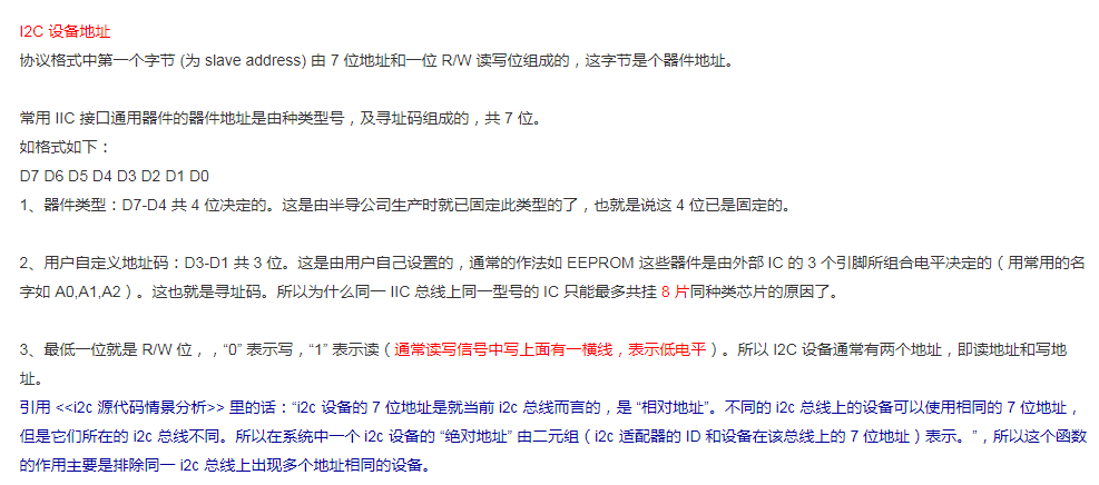 先来看一下原理图 这是个存储芯片。只用两跟引脚与CPU的I2C控制器相连,一个就是I2C_SCL一个就是I2C_SDA。CPU上的I2C_SCL和I2C_SDA上可以接很多芯片。每个芯片都会有个设备ID, 或者称为设备地址,去看芯片的原理图,里面都有设备的地址,比如说我们这里的FM24CL04。 I2C硬件协议 首先CPU会发出一个start信号,保持SCL为高电平,SDA由高变为低...