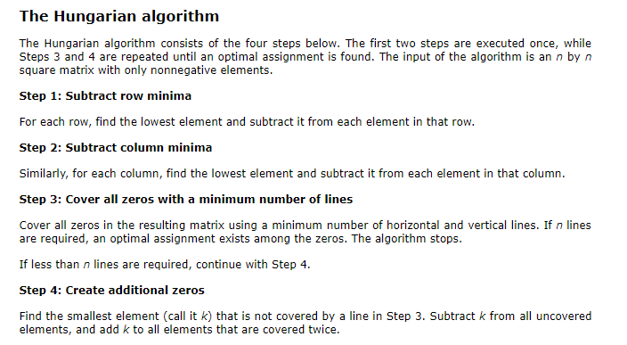 英文版的讲的很详细: http://www.hungarianalgorithm.com/examplehungarianalgorithm.php 中文版的可以参考该博主: https://blog.csdn.net/qq_33829154/article/details/62425921 匈牙利算法的流程: 匈牙利算法包含四步。前两步一次执行完,第三步和第三步会重复执行直到最优分配出现。算法的...