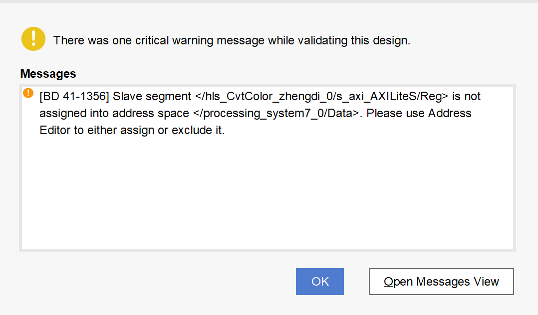 今天在更换ip核时,报错误如上图: [BD 41-1356]</hls\u CvtColor\u zhengdi\u 1/s\u axi\u AXILiteS/Reg>未分配到地址空间</processing\u system7\u 0/Data>。请使用地址编辑器分配或排除它。 原先使用该种接口,不报错。 一开始怀疑是s_axi_AXILITES的接口类型有问题。在viv...