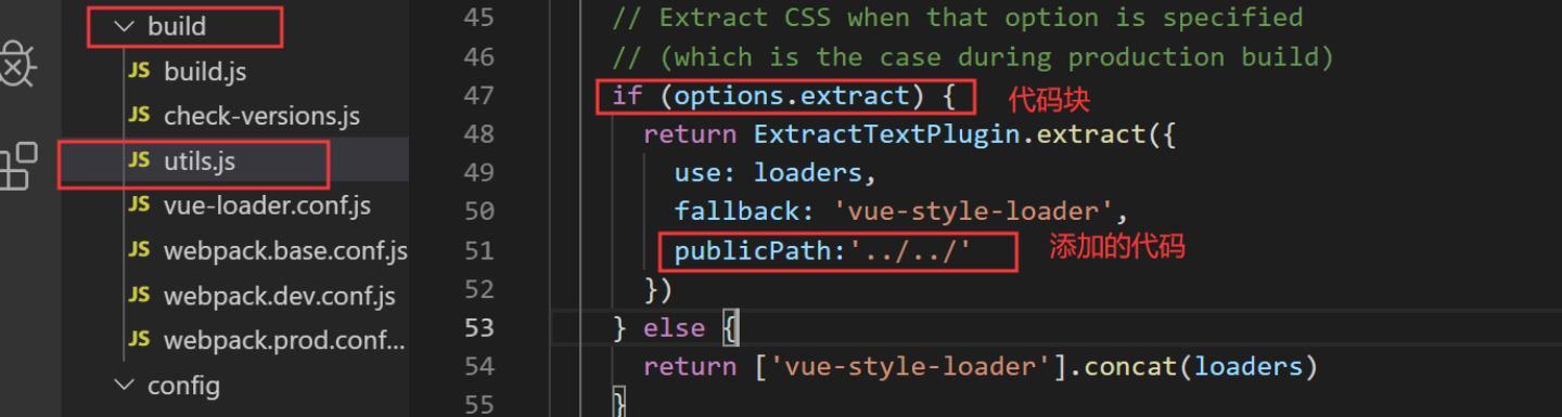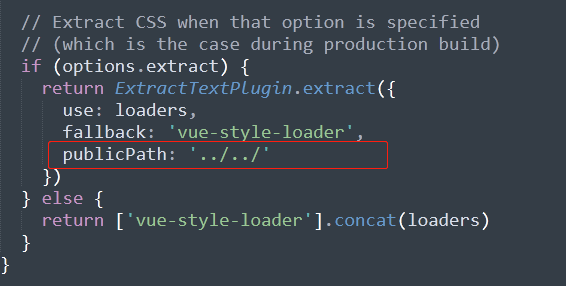 vue项目打包后css文件中图片404解决方法 在生成的脚手架中build的文件夹中打开utils.js找到代码块 if (options.extract) { return ExtractTextPlugin.extract({ use: loaders, fallback: 'vue-style-loader', }) } else { return ['vue