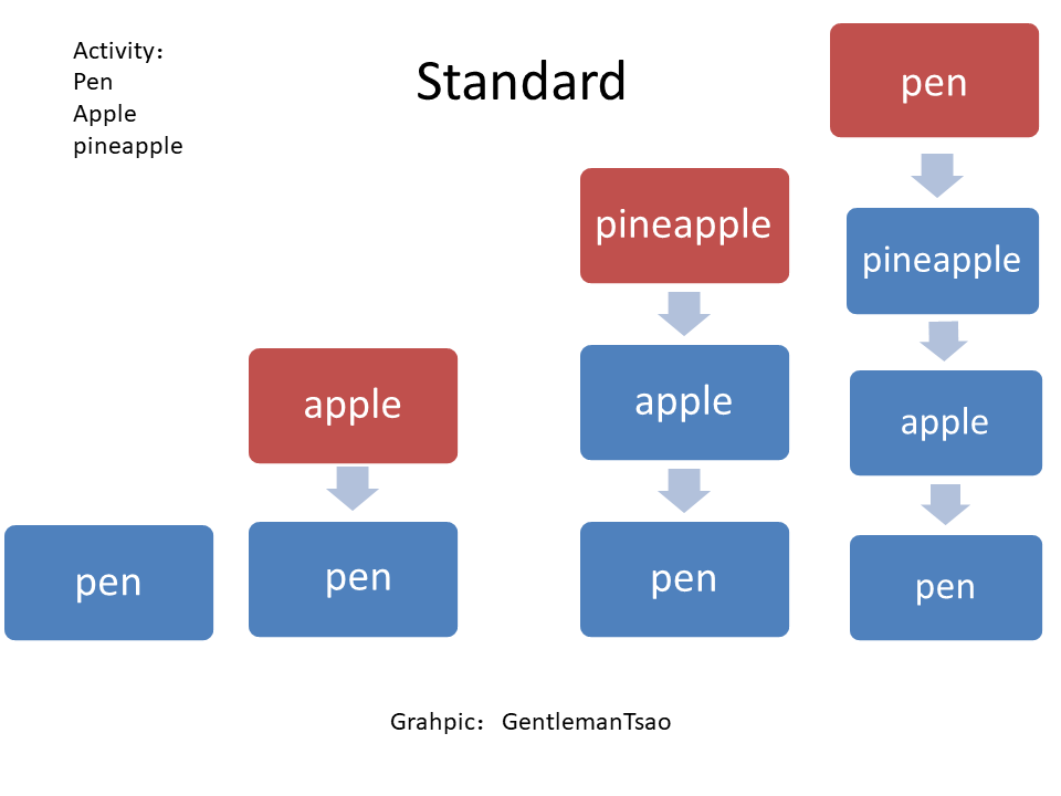 此博文写作坚持以下理念: 图胜于表,表胜于言; 最好的解释是不用解释; 连连看规则 玩过连连看吗?回顾下连连看的规则: 将相同花色的两个方块用三根以内的直线连在一起就可以消除。 为了有效管理activity,google在玩过连连看后,把该规则适当改进也套用到activity上了。下面我们就来具体试玩一下吧。 Activity的四种启动模式(四种玩法) 玩法一:standard 规则:叠放,不消除...