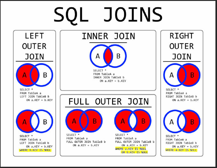 https://www.cnblogs.com/reaptomorrow-flydream/p/8145610.html 表A 和 表B 1、inner join 结果 2、Left join LEFT JOIN返回左表的全部行和右表满足ON条件的行,如果左表的行在右表中没有匹配,那么这一行右表中对应数据用NULL代替。 3、Right join RIGHT JOIN返回...