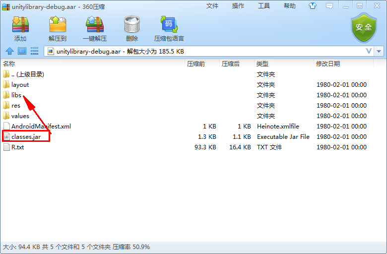 以后把aar和AndroidManifest.xml拖到Unity的plugins文件夹的Android子文件夹里,使用方法跟jar的一样,参考Android Studio导出Jar包、扩展Unity... Studio导出的aar包。 aar相当于Android Studio把Unity要用到的资源(libs、res等)压缩到aar里,aar可以说就是一个压缩包。 根据上一篇的操作后,Android