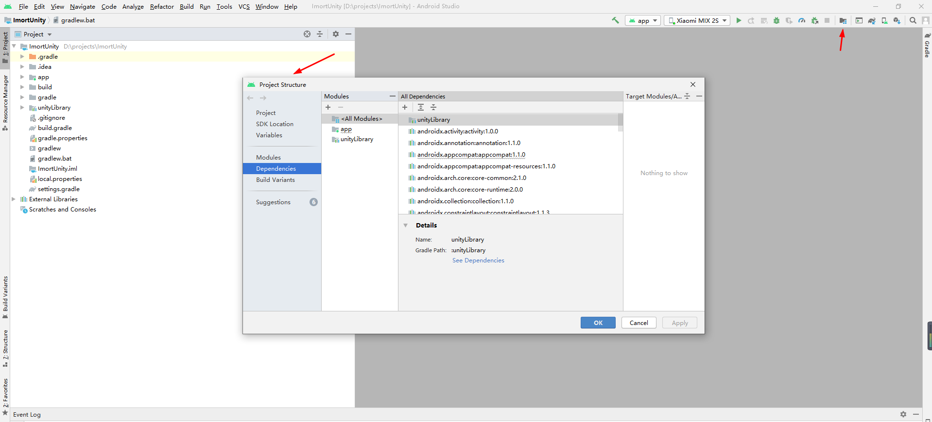 \ Development\Classes的classes.jar放到Android Studio项目libs下; 新建一个Library(在这种格式下才可以导出unity所需要的aar或jar文件),并设置好与...文件以及MainActivity文件(MainActivity要继承UnityPlayerActivity,因为Unity导出的apk需要展示在Unity环境中,如果继承自Activity,那么显示的