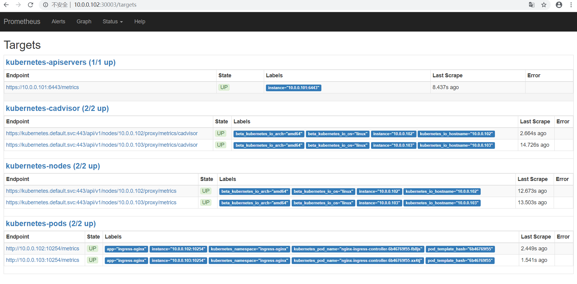 1.k8s集群搭建 2.部署Prometheus 1.master/node节点环境部署 在master可以进行安装部署 安装git,并下载相关yaml文件 git clone https://github.com/wenpengfan/k8s-prometheus.git 2.在node节点下载监控所需镜像 docker pull prom/node-exporter docker pull