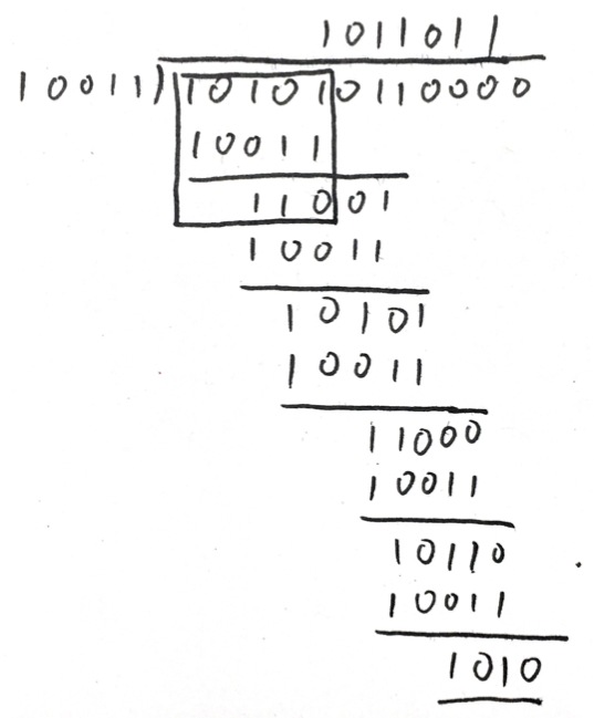 与海明校验码类似,CRC码也是数据通讯中常用的校验方式。 CRC 算法的基本思想是将传输的数据当做一个位数很长的数。将这个数除以另一个数。得到的余数作为校验数据附加到原数据后面。 结构 与海明校验码数据位和校验位穿插不同,CRC码中,校验位(R位)在信息位(K位)后面 计算校验位 以一个题目为例:设待校验的数据为。D8~D1 = 10101011,若采用CRC,且生成多项式为 10011,则其