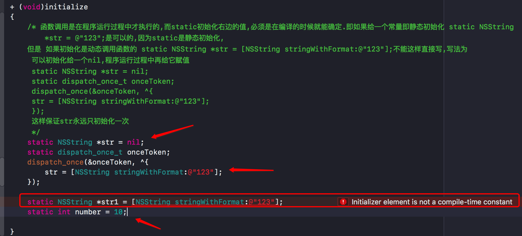 函数调用是在程序运行过程中才执行的,而static初始化右边的值,必须是在编译的时候就能确定.即如果给一个常量即静态初始化 static NSString *str = @“123”;是可以的,因为static是静态初始化, 但是 如果初始化是动态调用函数的 static NSString *str = [NSString stringWithFormat:@“...