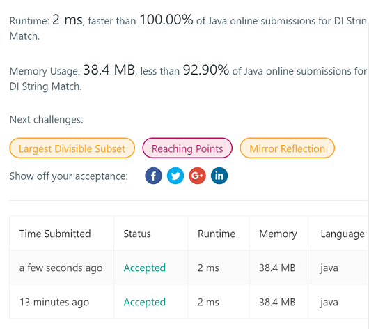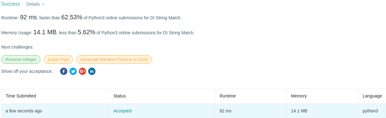 942. DI String Match 下班到家后,刷了刷leetcode,发现了一道很有意思的小题,题目如下: Given a string S that only contains “I” (increase) or “D” (decrease), let N = S.length. Return any permutation A of [0...