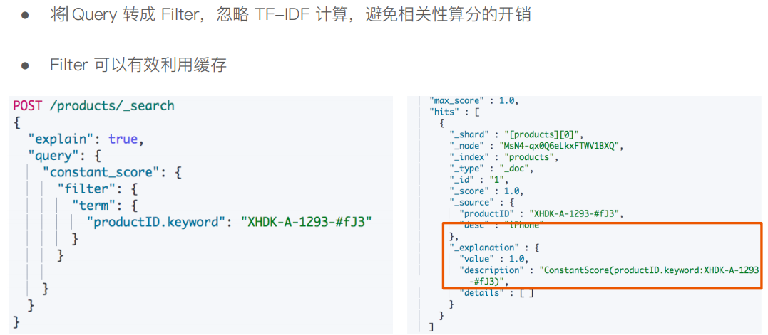 Filter 将 Query 转成 Filter,忽略 TF-IDF 计算,避免相关性算分的开销 Filter 可以有效利⽤缓存 3、基于全⽂的查询 基于全⽂本的查找 ● Match Query / Match Phrase Query / Query String Query ● 特点 ● 索引和搜索时都会进⾏分词,查询字符串先传递到⼀个合适的分词器,然后⽣成⼀个供查询的词项列表 ● 查询时候,先会