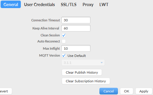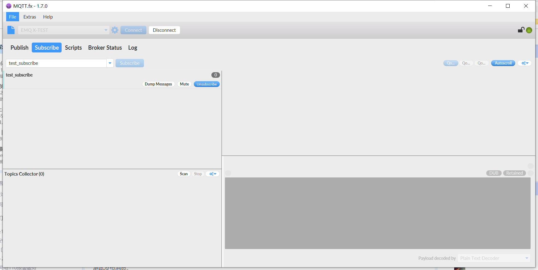 MQTT.FX的基本使用 MQTT.FX的基本使用 MQTT.FX的基本使用 下载安装MQTT.FX for mac 首先创建连接,并且输入用户信息 点击Connect进行连接,当右边出现绿色代表连接成功 在Subscribe上选择你需要订阅的主题,便能即时去接受从publish传来的数据 在Subscribe可以订阅多个Topic,最多六个;并且在界面的右下显示Subscribe监听的数据