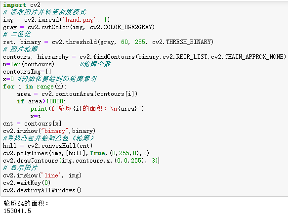 Fu Xianjun. All Rights Reserved. 练习1:实物凸包检测¶ import cv2 # 读取图片并转至灰度模式 img = cv2.imread('hand.png', 1) gray = cv2.cvtColor(img, cv2.COLOR_BGR2GRAY) # 二值化 ret, binary = cv2.threshold(gray, 6...