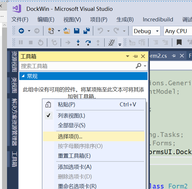 weiFenLuo.winFormsUI.Docking.dll是一个页面布局控件,可以实现子窗口在主窗口上任意贴边停靠、浮动、Tab化。Dock翻译为码头,就是说子窗口停靠到码头上,很形象啊。 使用过程: 1. 准备控件的dll文件,网上可以下载到。 2. 一个小例子 这里创建了一个C#的window Form工程,中有两个form,form1,form2,form1为主窗口,做为码头使用的,f...
