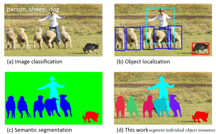 Image Classification 图片分类 cnn,alexnet vgg object detection 目标检测 rcnn,fast rcnn, faster rcnn semantic scene labeling 语义分割 fcn instance segment 实例分割 mask rcnn