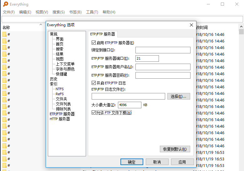 场景:笔记本需要台式机中的文件 工具:Everything 前提:两台电脑之间能够ping,如果不能,关掉台式机的防火墙,再试试 1,查找台式机的ip地址:ipconfig 2,在笔记本ping台式机ip:ping 10.4.126.46 3,在台式机上,打开Everything->工具->选项,如下,切记,勾选允许FTP文件下载 4,在笔记本文件路径中输入:tfp