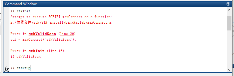 关于stk与matlab的版本对应关系以及一般正确的连接方式请看谈谈AGI STK跟matlab的互联问题。通过看这篇文章,我重新下载了matlab和stk的版本,使用了STK11和matlab2015b,在STK端查看edit-preference-matlab都没有问题,但在但出现了这样的报错: Attempt to execute SCRIPT mexConnect as a functio...