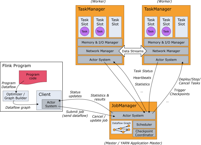 Flink运行时包含2种进程:1个JobManager和至少1个TaskManager 严格上说, 客户端不是运行和程序执行的一部分, 而是用于准备和发送dataflow到JobManager. 然后客户端可以断开与JobManager的连接(detached mode), 也可以继续保持与JobManager的连接(attached mode) 客户端作为触发执行的...
