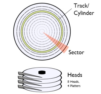 2019独角兽企业重金招聘Python工程师标准>>> 1.磁道 以盘片中心为圆心,用不同的半径,划分出不同的很窄的圆环形区域,称为磁道。 2.柱面 上下一串盘片中,相同半径的磁道所组成的一个圆柱型的环壁,就称为柱面。 3.扇区 磁盘上的每个磁道被等分为若干个弧段,这些弧段便是磁盘的扇区.扇区是磁盘最小的物理存储单元 4.磁盘簇(windows) windows将相邻的扇区组合在...