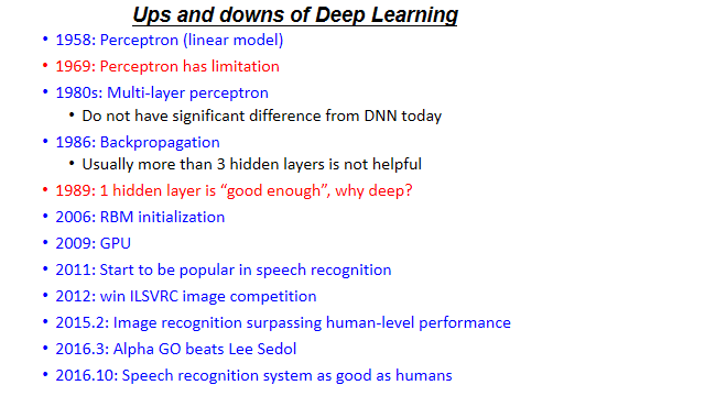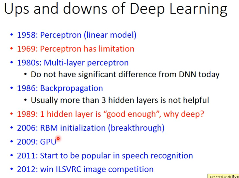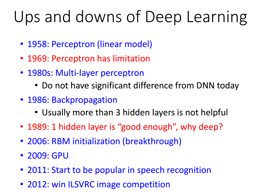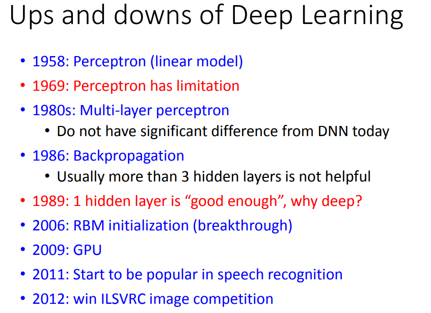 注意: 1 Muti-layer perceptron 类似于 DNN 2 2006年,用RBM找的初始化参数的神经网络叫做DeepLearning,否则则是1980年代的Muti-layer perceptron。用到了很多较难的方法做initialization,带来的帮助并不大。 3 一般大的DeepLearning,训练要几周,后来用GPU,可以加速 注意: 1 Step1中的a...