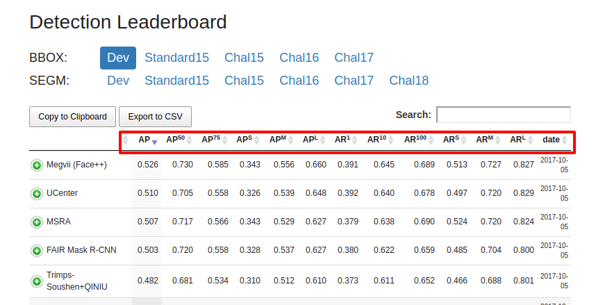COCO数据集是目前最流行的目标检测比赛用的数据集,且时下几乎所有在各大深度学习框架下实现的目标检测网络的预训练模型都有基于COCO数据集训练出来的。接下来简要介绍一下COCO比赛排行榜中所用的指标,截图如下: 指标介绍 AveragePrecision(AP):AveragePrecision(AP):      % AP at IoU=0.50