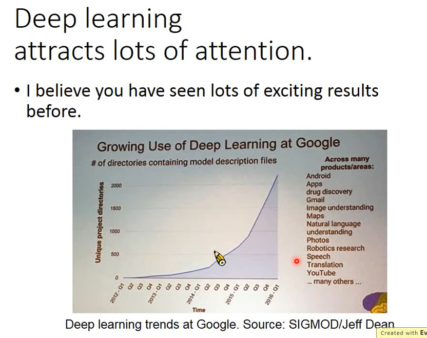 上午没有学习,吃成一只猪。 1.有了几个名词概念的基础,开始了啊Deep Learning的简短介绍: 第一张图:随着时间的推移,Deep Learning的应用暴涨 2.今天天津已经热到了40度,热到头疼,烦躁,厌烦,不开心! 3.介绍了一下Deep Learning这些年的反反复复的发展,从开始的只对光敏感,到hidden layer的层数,一个隐藏层可以代表任意的函数,到initializa...