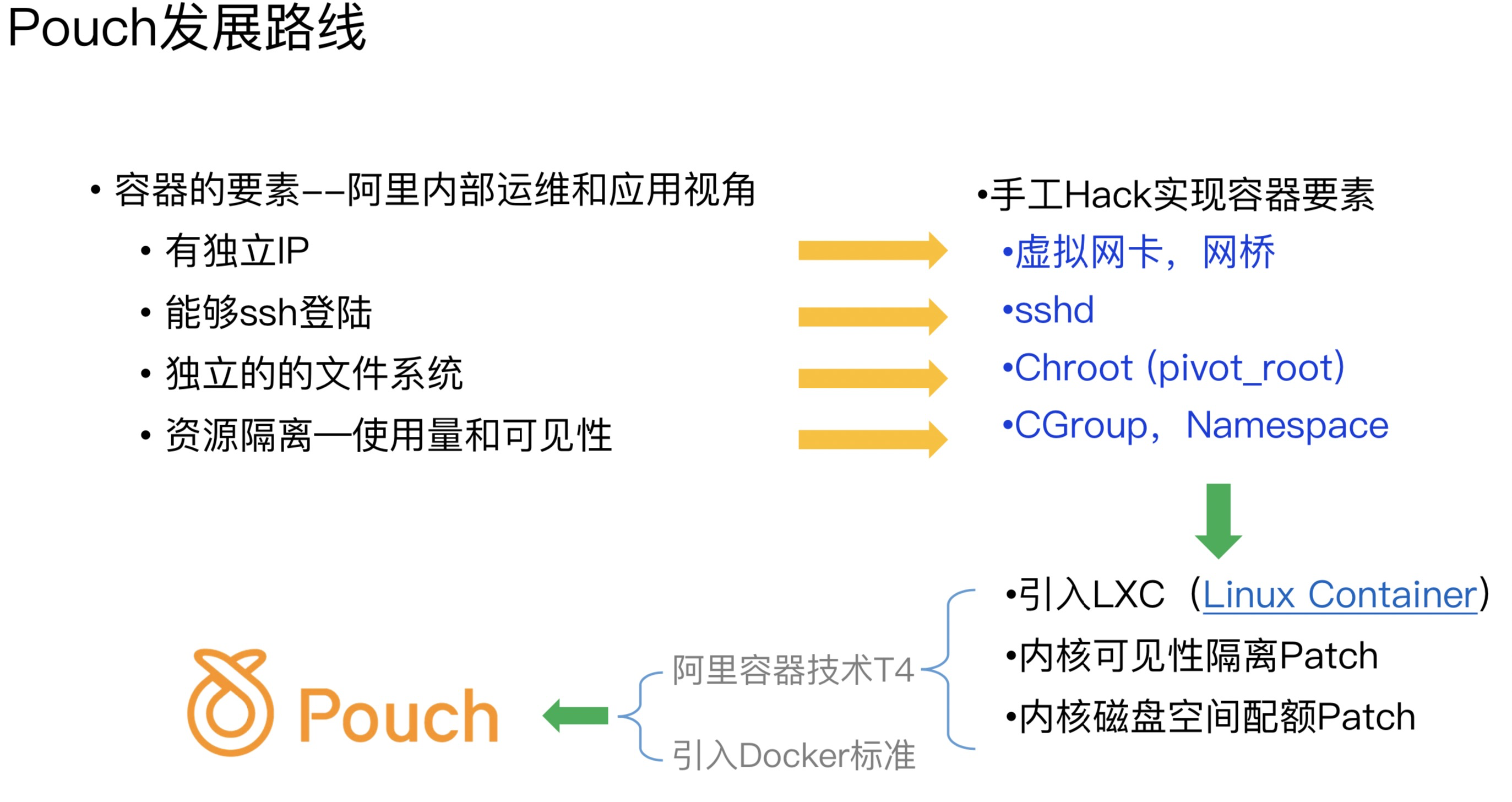 Pouch简介 • 本意育⼉儿袋,隐喻贴身呵护应⽤用 • 始于2011年年,基于LXC • 阿⾥里里内部容器器技术产品,并于当年年上线 • 2015年年初开始吸收Docker镜像功能 • 容器器结合阿⾥里里内核,⼤大幅提⾼高隔离性 • 百万级规模部署于阿⾥里里集团内部